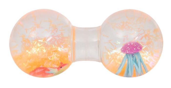Dieser Anti-Stress-Doppelball ist ein echter Hingucker: Bei jedem Drücken flitzen Axolotl oder Quallen lustig zwischen den beiden transparenten Enden hin und her.
