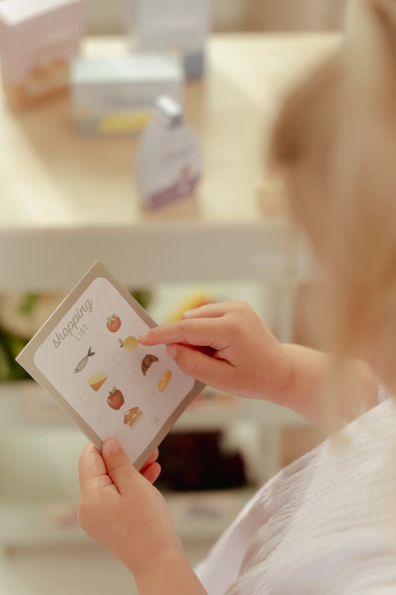 Einkaufen wird zum Vergnügen! Mit diesem hölzernen Spiel-Einkaufswagen holst du alles ins Haus, was du brauchst. Dank des großzügigen Stauraums passen all deine Einkäufe hinein, selbst wenn die Liste lang ist. Der hölzerne Clip sorgt dafür, dass deine Einkaufsliste gut befestigt bleibt, sodass du nichts vergisst. Das Set enthält verschiedene Einkaufsprodukte und eine Einkaufstasche, damit du sofort loslegen kannst. Der Einkaufswagen ist mit einer lustigen Illustration auf der Vorderseite verziert, was das Spielen noch unterhaltsamer macht. Möchtest du das ultimative Einkaufserlebnis? Kombiniere den Einkaufswagen mit dem Marktstand und genieße endloses Einkaufen!